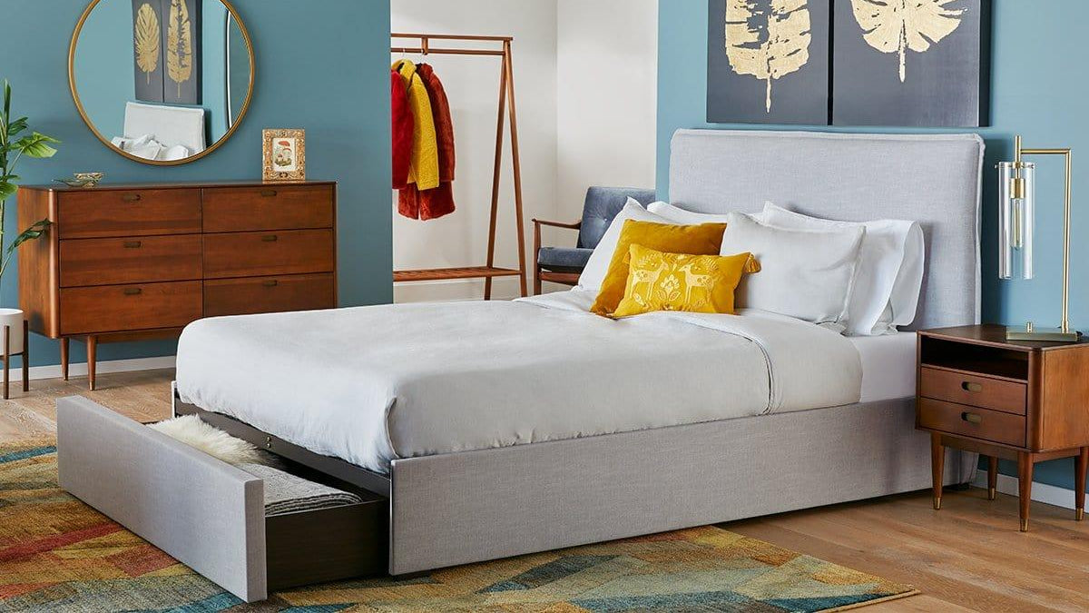 Le lit de rangement rembourré Blake combine un design scandinave moderne avec des solutions de rangement pratiques.